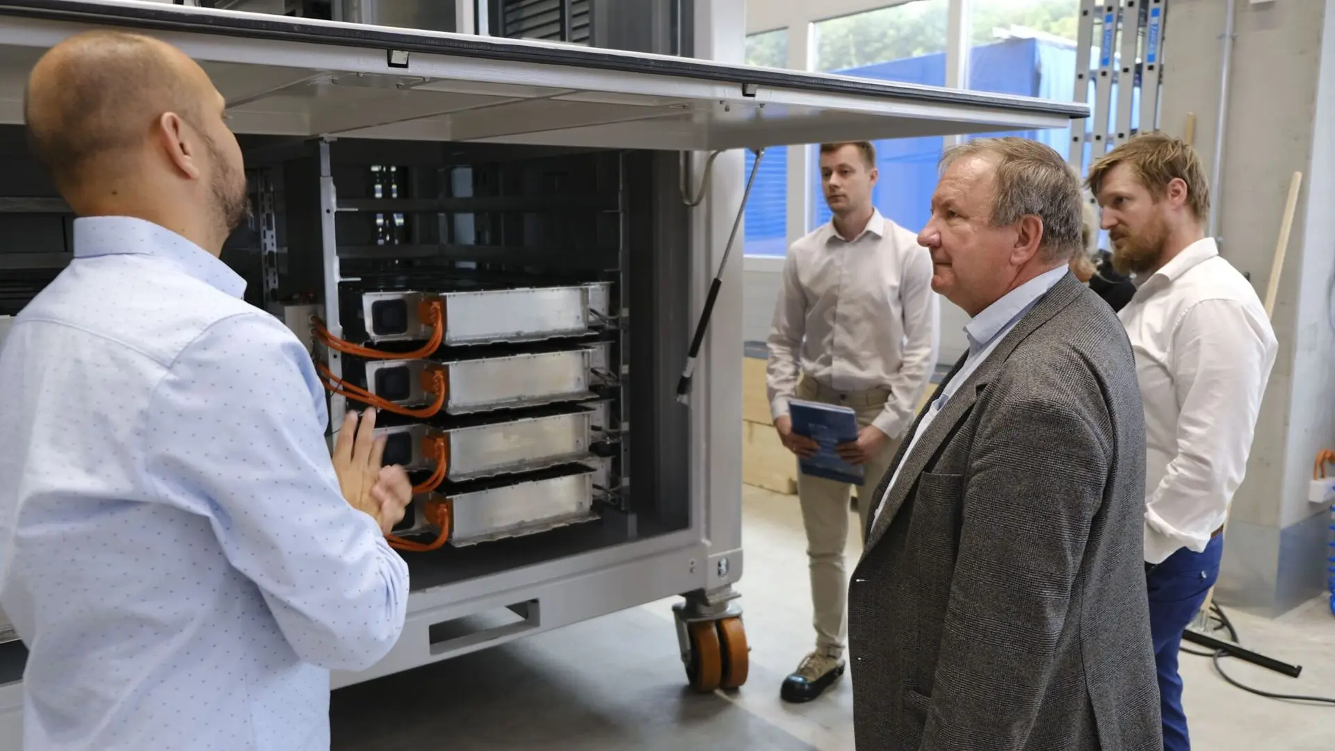 Präsentation des Industrial M – Innenansicht – von rechts nach links: Tomáš Bílek (Executive Manager – Sales International), Dr. Vytautas Jokužis (CEO Elinta), Leonhard Kriegl (Bereichsleitung Vertrieb & Kundenbetreuung Heim- und Gewerbespeicher), Martynas Vrašinskas (Projektleiter und Ingenieur, Elinta).