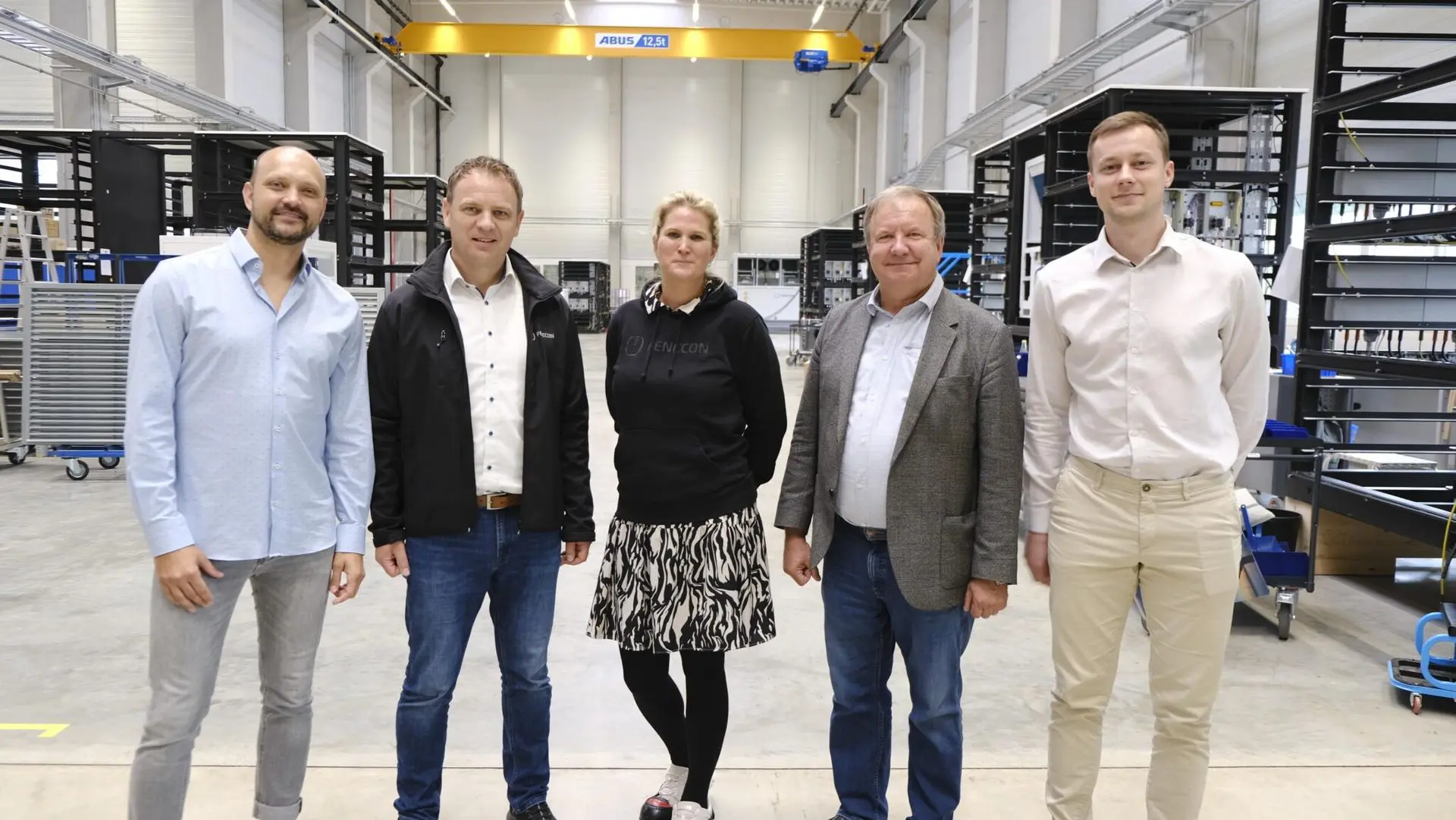 Gruppenfoto in der Produktionshalle Iggensbach – von links nach rechts: Tomáš Bílek (Executive Manager – Sales International), Franz-Josef Feilmeier (CEO), Katerina Bílek (Partner Manager International), Dr. Vytautas Jokužis (CEO Elinta), Martynas Vrašinskas (Project Manager and Engineer, Elinta).