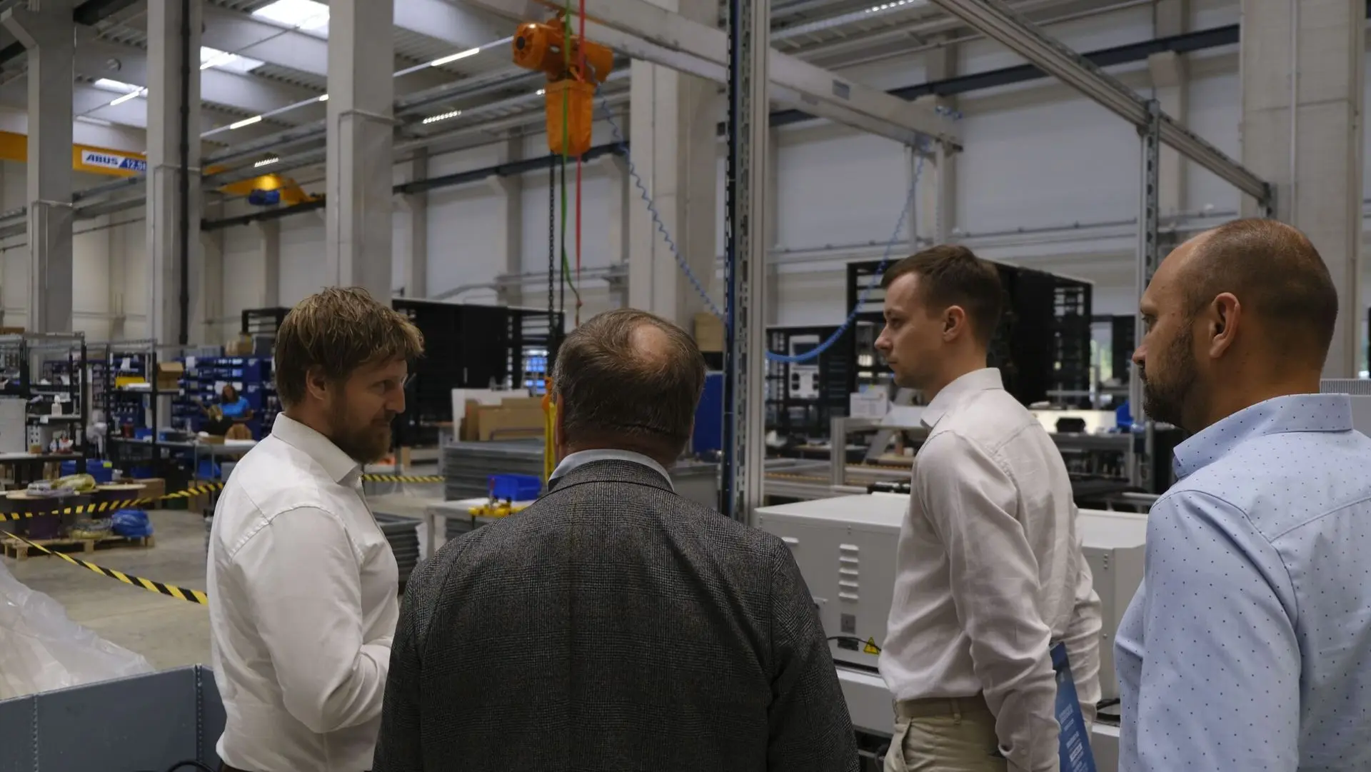 Rundgang durch die Produktionshalle Iggensbach – von links nach rechts: Leonhard Kriegl (Bereichsleitung Vertrieb & Kundenbetreuung Heim- und Gewerbespeicher), Dr. Vytautas Jokužis (CEO Elinta), Martynas Vrašinskas (Projektleiter und Ingenieur, Elinta), Tomáš Bílek (Executive Manager – Sales International).