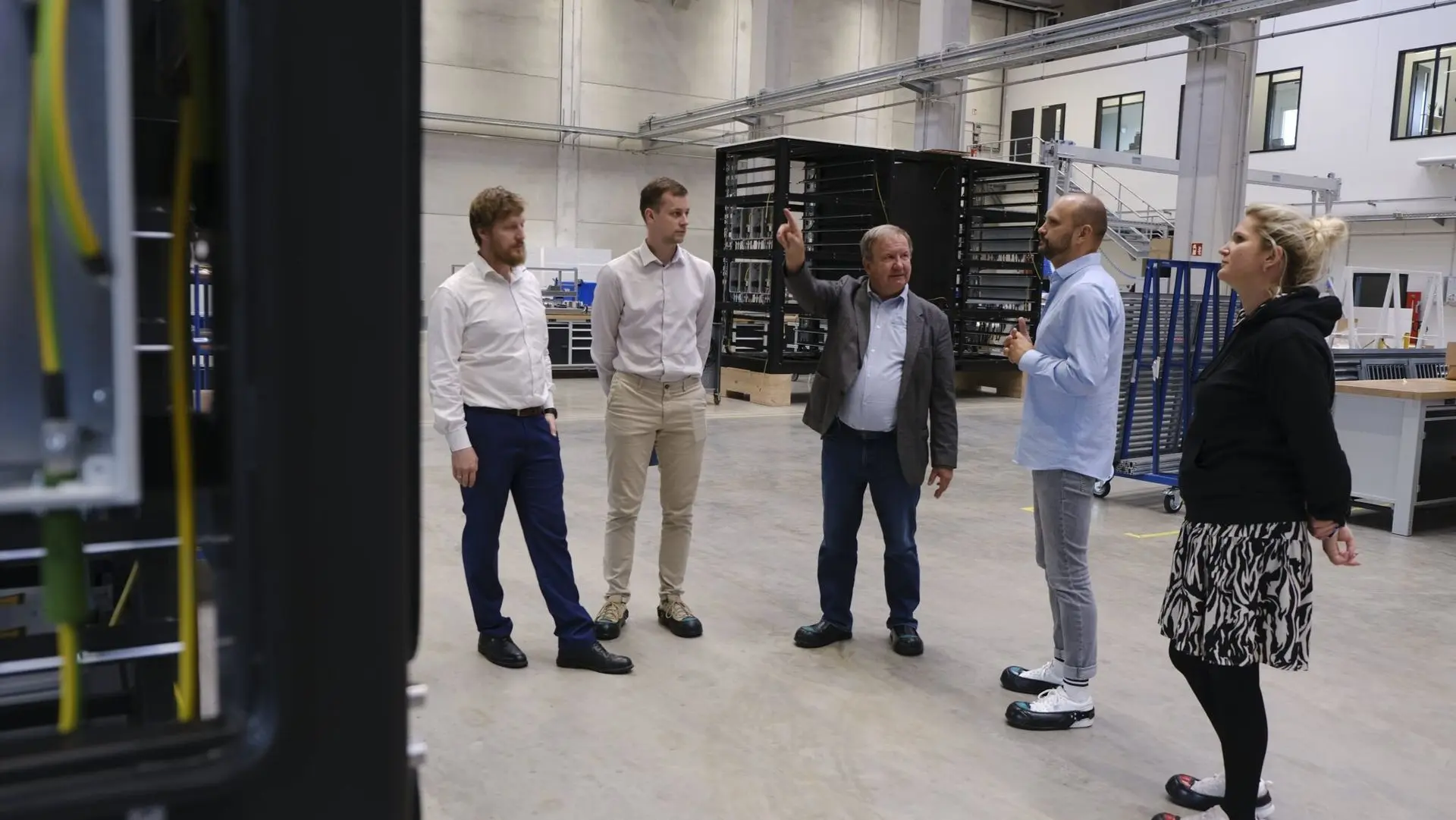 Fortsetzung des Rundgangs durch die Produktionshalle in Iggensbach – von rechts nach links: Katerina Bílek (Partner Manager International), Tomáš Bílek (Executive Manager – Sales International), Dr. Vytautas Jokužis (CEO Elinta), Martynas Vrašinskas (Projektleiter und Ingenieur, Elinta), Leonhard Kriegl (Bereichsleitung Vertrieb & Kundenbetreuung Heim- und Gewerbespeicher).