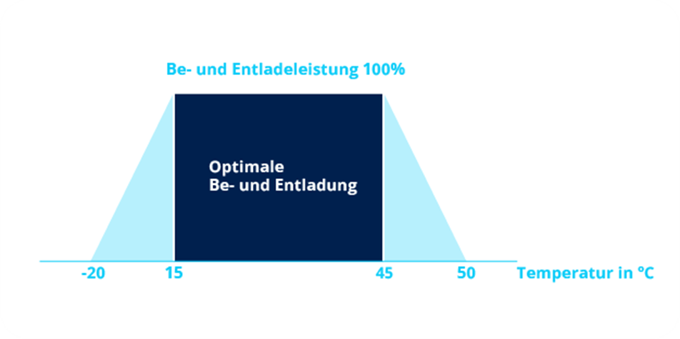 Im optimalen Temperaturbereich zwischen 15 °C und 45 °C steht die volle Be- und Entladeleistung zur Verfügung. Bei sehr hohen oder sehr niedrigen Temperaturen reduziert sich die Leistungsfähigkeit, die Funktionsfähigkeit des Speichers bleibt jedoch erhalten.