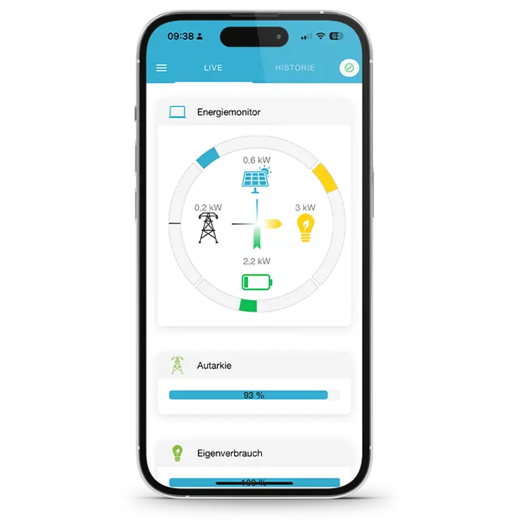 Über das Online-Monitoring im Browser oder per App (Android & iOS) behalten Sie Ihre Energie jederzeit im Blick. Mit Live-Daten, klaren Analysen und einer lokal gespeicherten Historie, die Ihnen volle Transparenz bietet. Ihre Daten sind dabei dank Cyber Security by Design, deutscher Server und einem Entwicklungsteam in Deutschland immer geschützt. Natürlich nach deutschem Datenschutz- und IT-Sicherheitsstandard.